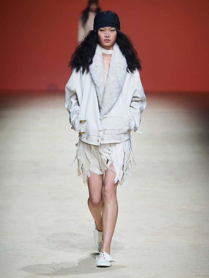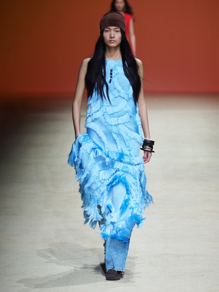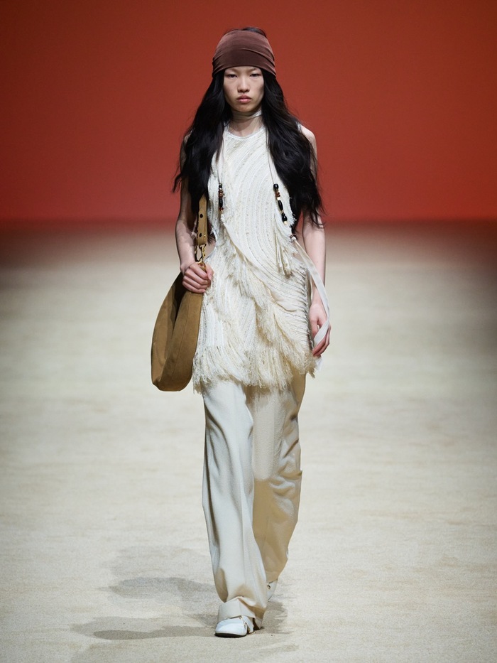 在秀场上,造型师Jojo Qian通过折叠与纹理的巧妙融合,呈现了充满游牧文化气息的作品。同时,音乐人哈拉木吉将现代电音与传统蒙古马头琴相结合,营造出一场音符与服装并行的时尚盛宴,让人仿佛置身广袤草原,感受自然与自由的呼吸。