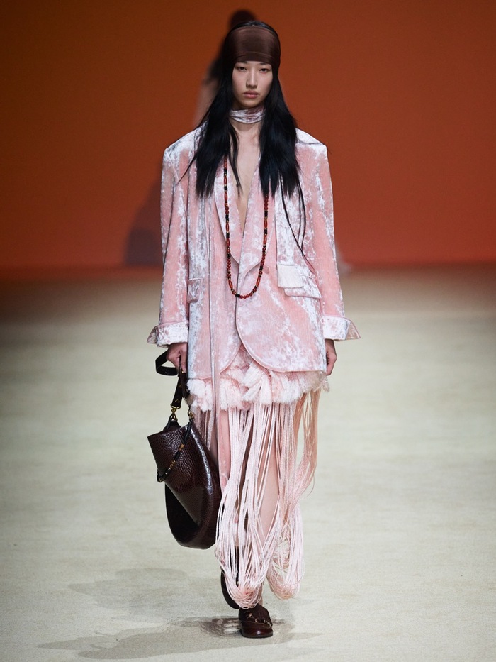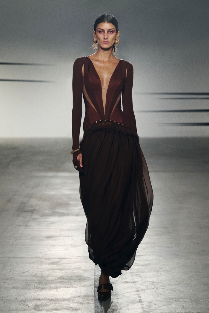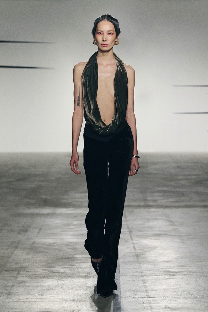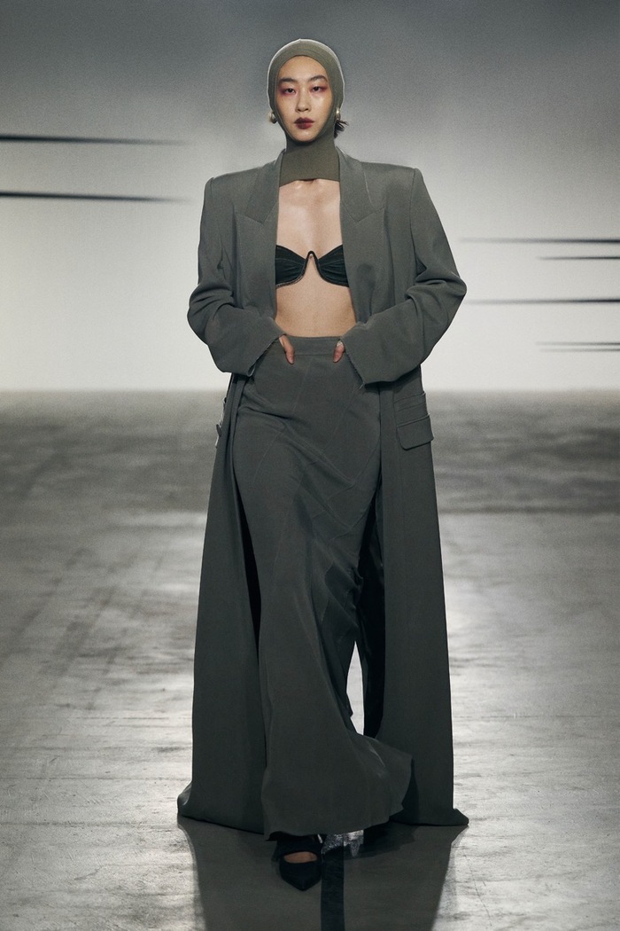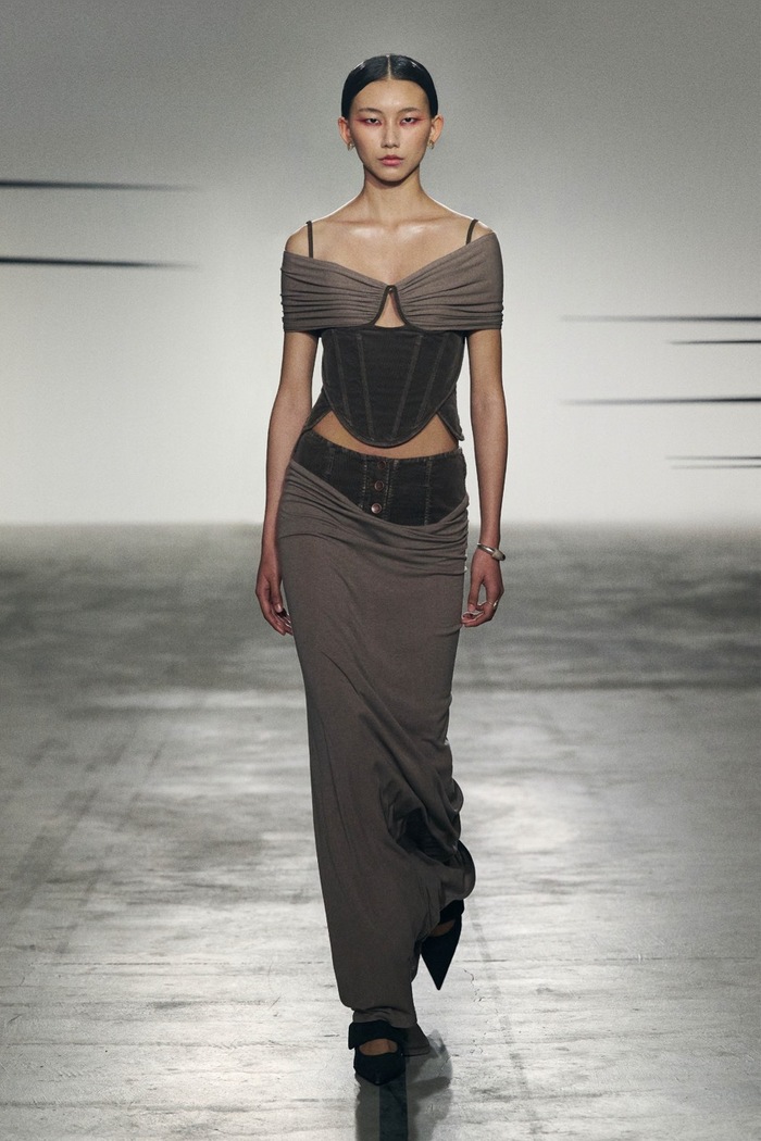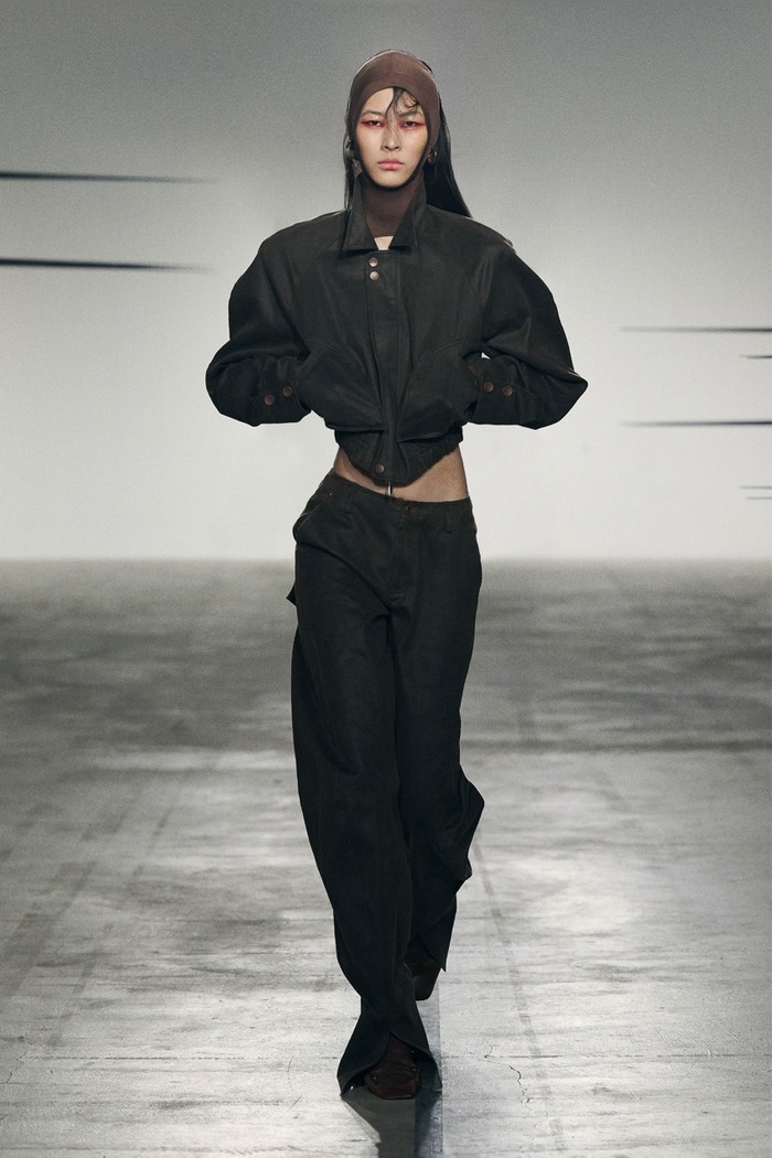 OUDE WAAG用柔软与锋利的碰撞设计,探讨当代个体在剧变世界中的感受与成长。整场发布会氤氲着欧臻廷「BECOME轮回」香水的木质香气,宛如置身寂静山林。服装色调回归自然,以棉田与荆棘丛为灵感,采用灰棕、墨绿与暗红,拒绝对伤痛的美化,而是勇敢面对和包容。设计语言上,丝绒、灯芯绒、环保皮革等材质交错使用,呈现刚柔并济的视觉张力。飘带西装、宽肩夹克与轻盈真丝裙装之间形成力量的对峙,展现OUDEWAAG女性独有的矛盾气质与复杂美学。