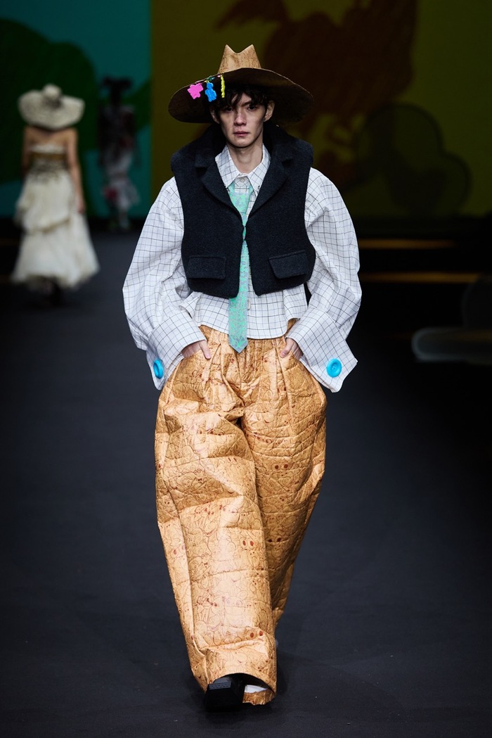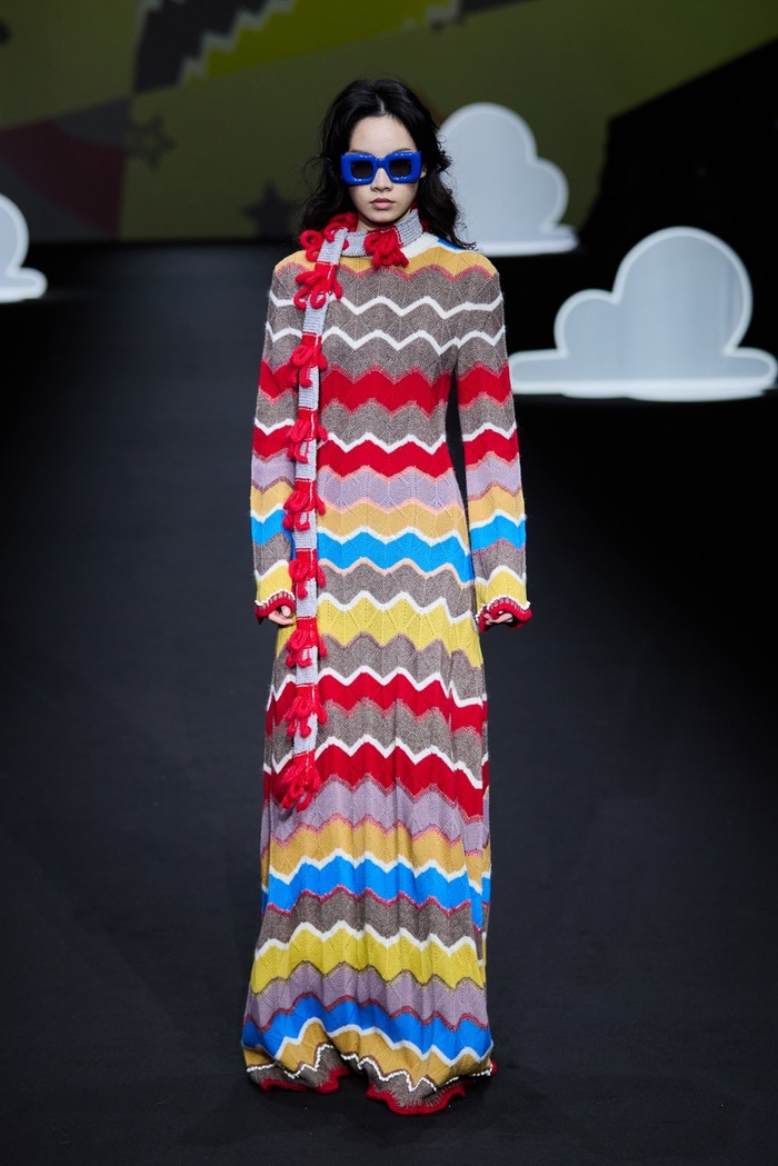 大秀分为四大篇章——“冒险的起点”“未知的挑战”“梦想的飞行”与“友谊的陪伴”,每一段都如同一次风格变奏:解构与重组、柔软与锋锐、复古与未来并置共存。从玩偶结构中提取廓形线条,以针织、串珠、亮片等多样材质表达玩具的质感世界;色彩灵感源于动画原色,拼接、撞色、套染大胆前卫,像是童年记忆的调色板在T台上被重新激活。