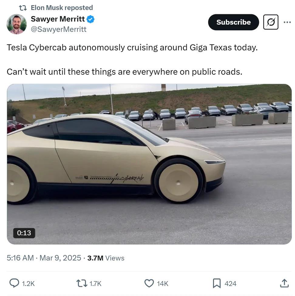 " 特斯拉 Cybercab 今天在得克萨斯超级工厂附近自动驾驶巡游。真等不及这些车遍布公共道路的那一天了。"