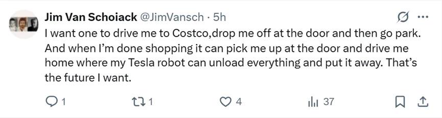 " 我想让一个人开车送我去 Costco,把我送到门口,然后去停车。当我购物完后,它可以在门口接我并开车送我回家,我的 Tesla 机器人可以在那里卸下所有东西并收起来。这就是我想要的未来。"