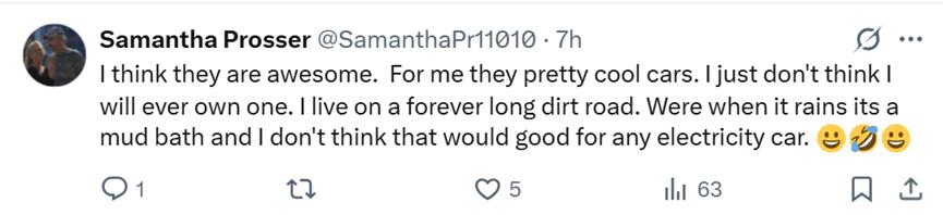 " 我认为他们很棒。对我来说,他们是非常酷的汽车。我只是觉得我永远不会拥有它。我住在一条永远漫长的土路上。如果下雨时,它会变成泥浴,我认为这对任何电动汽车都没有好处。"