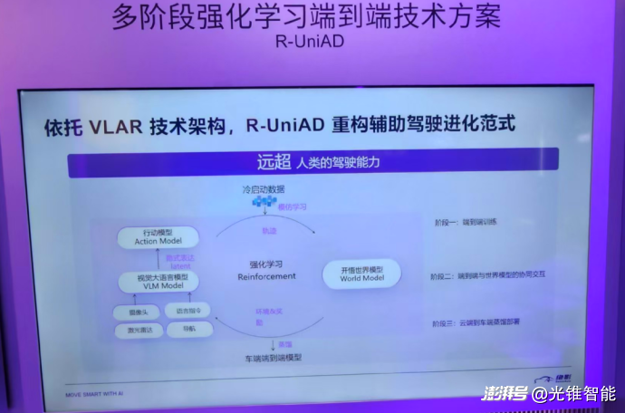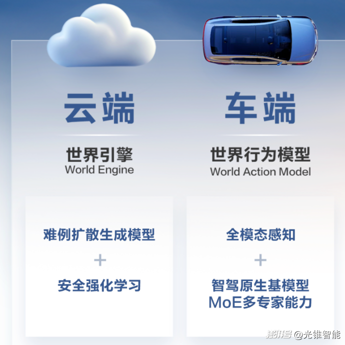 不过,就在当下低调宣传的背后,智驾技术正在迎来新的代际升级。在本次车展前,光锥智能了解到智驾研发的最新技术,已经从“端到端”升级至“更大的模型+世界模型训练+强化学习+云端蒸馏”的方案。