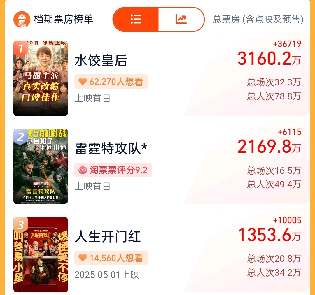 首页 > 生活 2025五一档新片电影总票房破亿 据网络平台,截至4月30日22时05分,2025年五一档新片(含重映)总票房(含点映及预售)突破1亿,影片《水饺皇后》《雷霆特攻队*》《人生开门红》《猎金·游戏》《幽灵公主》《苍茫的天涯是我的爱》暂列前六。