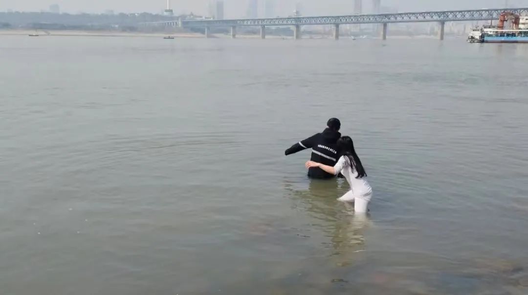 邓智慧靠近一看,发现男子身体僵直,一步一步地往水深处走,于是先在岸上喊他回来,没有回应。同事报了警,随后邓智慧脱掉外套下到水里,“他越走越远,我想靠近点,和他沟通,把他劝回来。”