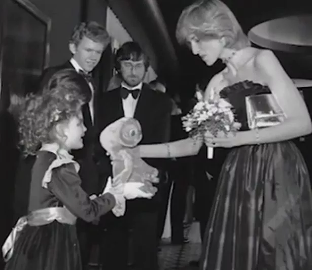 这张照片拍摄于德鲁出演大片《E.T.》期间,照片中她将一个外星人玩偶送给了已故的公主。
