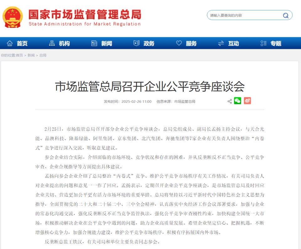 此外 IT 之家发现,市场监管总局曾在今年 2 月召开企业公平竞争座谈会,与天合光能、晶澳科技、隆基绿能、阿里集团、京东集团、北汽集团、奔驰集团等 7 家企业有关负责人围绕整治 " 内卷式 " 竞争进行深入交流。