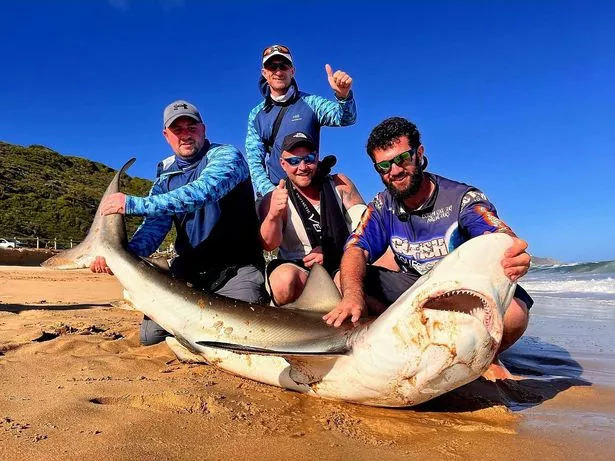 柯蒂斯·米勒(Curtis Miller)在袭击后与另一条被捕获的鲨鱼微笑(图片来源:威尔士新闻社)