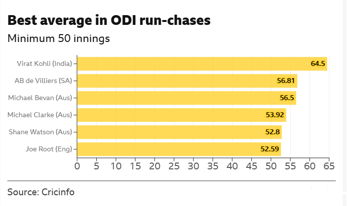Kohli职业生涯的ODI平均得分为64.50分,比排名第二的AB de Villiers高出近8分。
