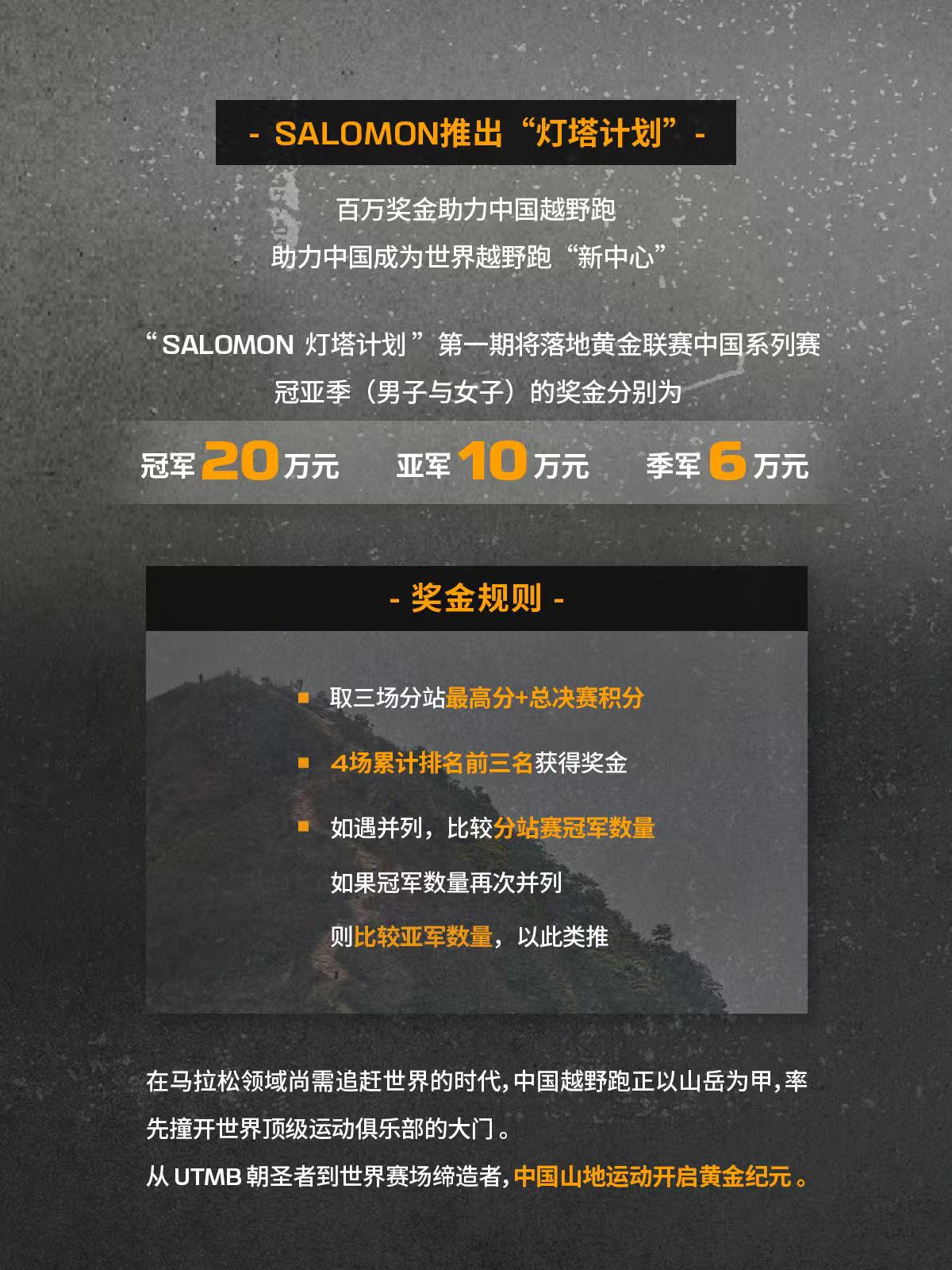 据该计划的组织者SALOMON官方介绍,这项“灯塔计划”将在2025年设立总额超过百万元人民币的奖金池,全面升级战略合作中的顶级越野赛事,包括黄金联赛和柴古唐斯越野赛等,进一步完善赛事奖金体系。