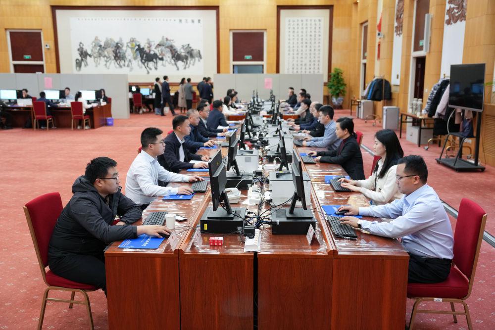 2025 年 3 月 9 日,十四届全国人大三次会议秘书处工作人员在认真工作。新华社记者 郑焕松 摄