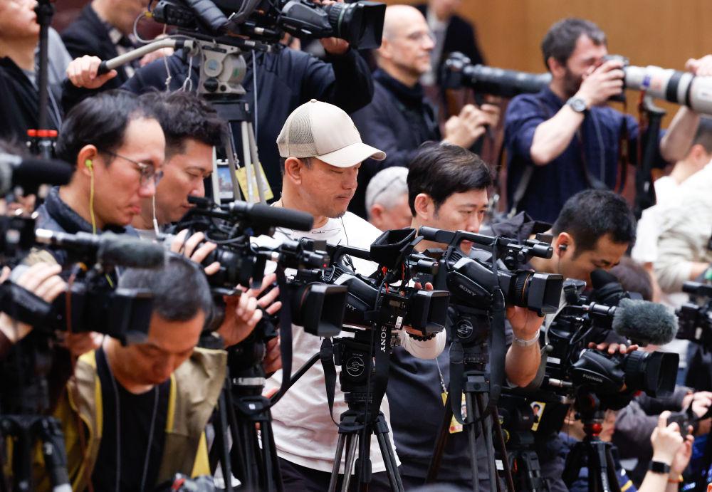 2025 年 3 月 10 日,全国政协十四届三次会议在北京人民大会堂举行闭幕会。这是记者在会场采访。新华社记者 张玉薇 摄