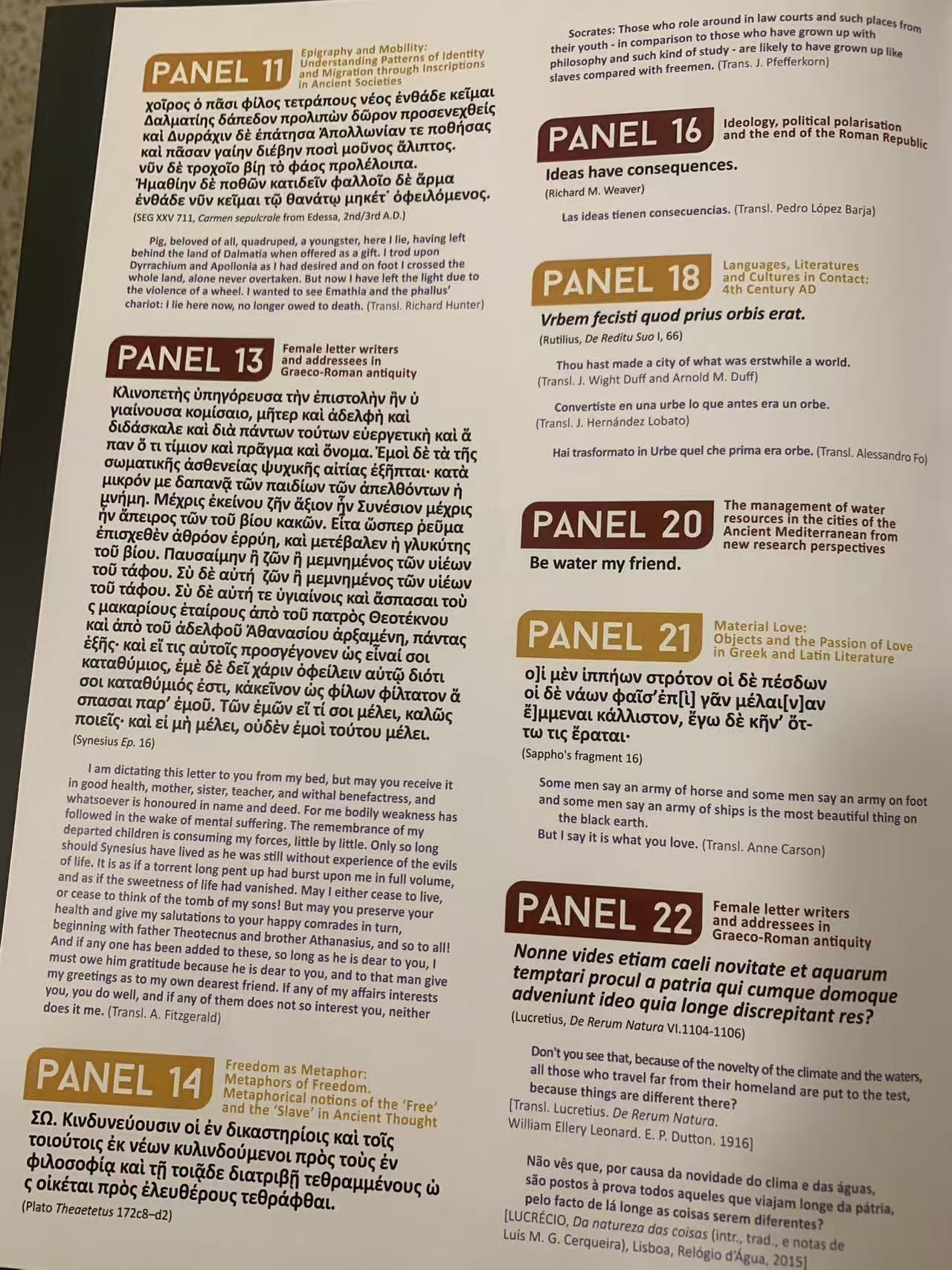 “古代碑铭中的边缘群体”分论坛则重点聚焦于女性、儿童、工匠、农民、同性恋等边缘群体,不同的铭文内容、风格与形制皆十分有趣。有定量分析研究碑铭与边缘群体的数量关系,探索碑铭载体与铭文内容的关联。议题涉及不同边缘群体的识字率和铭文中的错误、铭刻风格、字体变化、衬线变化幅度等多个方面。论坛中既有对碑铭研究方法论的反思,也有碑铭证史和单篇铭文的个案研究。虽然大部分学者都能阅读多种语言,但交流过程中语言的隔阂依然存在,一位意大利学者认为自己的英语口音太糟糕,于是选择用法语报告论文。而提问环节仍用意大利语进行,主持人起初打算翻译提问内容,但后来由于问题过于复杂而放弃。