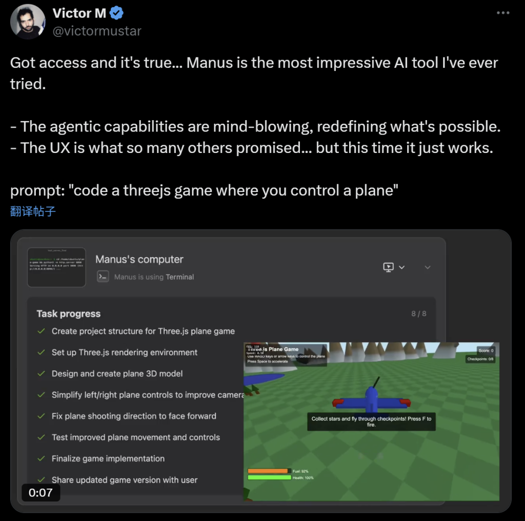 开源社区平台Hugging Face的产品负责人Victor Mustar也在体验过Manus之后对其表示赞扬,称其为“我所使用过的最令人印象深刻的AI工具”。Mustar展示了一个使用Manus编写的飞机小游戏,从视频中来看,该游戏基本完全符合他的要求。