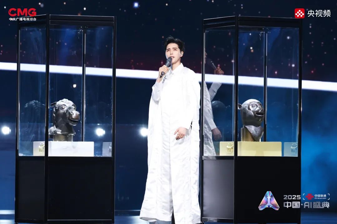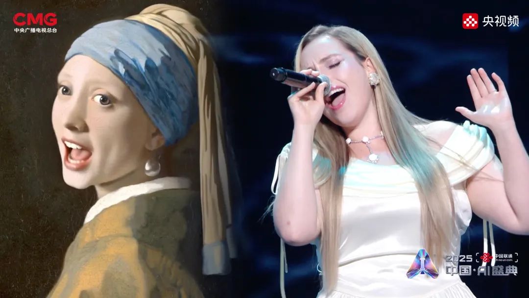相AI相生,是艺术想象的无限延展。在AI技术的赋能下,沉睡的文物重获新生:圆明园“十二兽首”(复制品)聚首盛典舞台,他们化身十二乐师与歌手阿云嘎共同演绎《浮光·十二兽首归来》,向世界展现东方文化艺术的魅力;《戴珍珠耳环的少女》在MiniMax海螺(Hailuo02)视频模型的驱动下翩然起舞,与歌手Grace Kinstler隔空对唱《This Is Me》;虚拟偶像“星瞳”与歌手黄龄突破次元壁,浪漫演绎金曲《玫瑰玫瑰我爱你》;根据歌手张英席、石倚洁、蔡程昱照片生成的数字人将与“本尊”同台献唱,以中、英、意等语言诠释经典歌剧歌曲《今夜无人入眠》;AIGC技术更让兵马俑开启环球之旅,在东西方文明的对话中完成文化使者的使命。