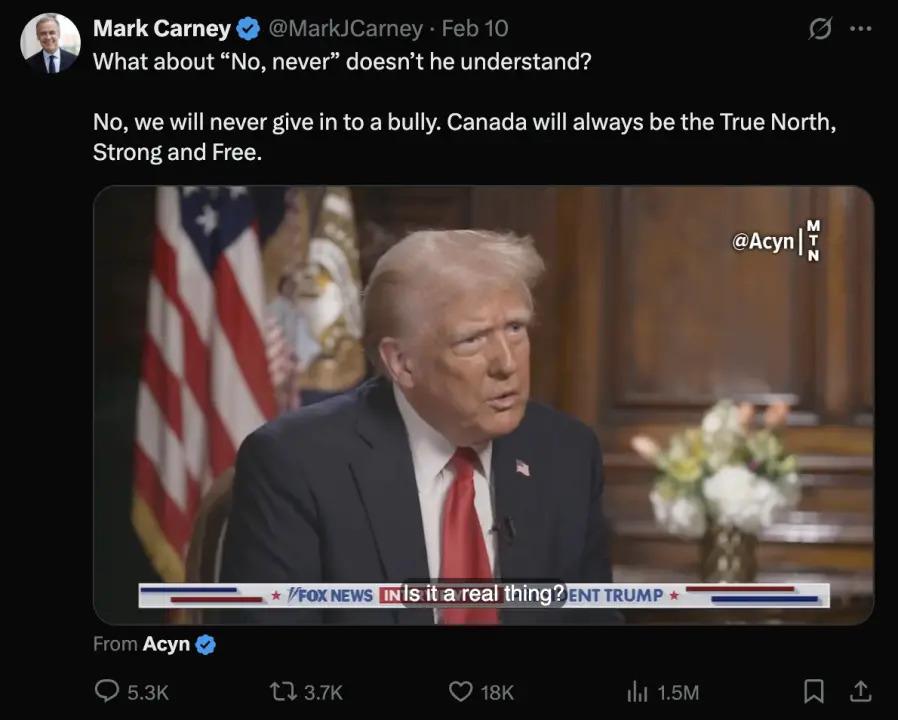 几天后,卡尼上传了一段视频,隔空喊话特朗普:" ‘不,绝不’是什么意思他还不明白吗?我们永远不会向恶霸屈服,加拿大强大而自由。"