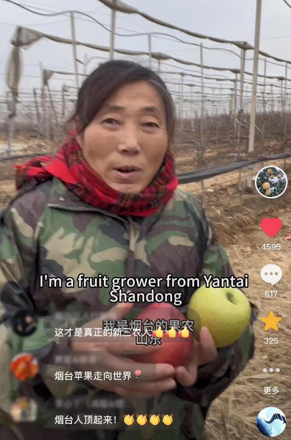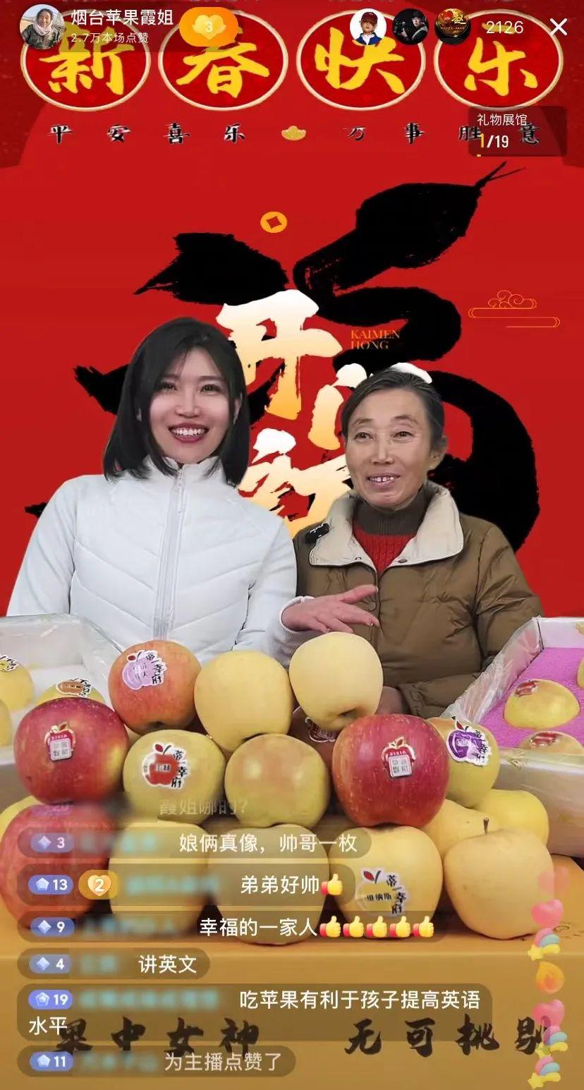 连李晓霞本人也觉得,一切很不真实:注册仅一个月,抖音账号 @烟台苹果霞姐 靠着土洋风格,收获了 36 万粉丝。同时,数千网友涌入了她的直播间抢购苹果。身为退休老师,她在苹果园重拾英语 " 讲台 ";作为母亲,她和儿子并肩战斗,为千亩果园开拓全新的电商销售渠道,以缓解贷款压力。