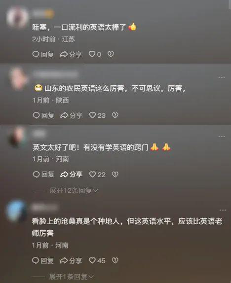 视频由李小丫剪辑之后,上传到抖音账号 @烟台苹果霞姐。没想到,首个短视频就爆了,获得 19.5 万点赞。很多网友觉得不可思议—— " 看脸上的沧桑真是个种地人,但这英语水平,比英语老师厉害。" 某条上万人点赞的评论里,一位网友写道:" 我家也有一个因锄头耽误的画家,就是我 68 岁的农民母亲。"