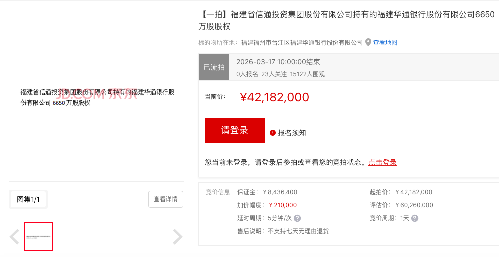 界面新闻记者|曾令俊尽管围观者超过1.5万人,起拍价已较评估价打了七折,但福建华通银行股份有限公司(...