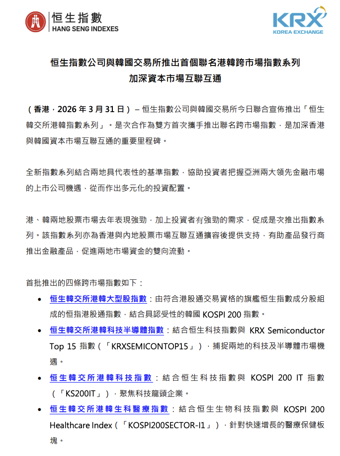 3月31日,恒生指数公司与韩国交易所联合宣布推出“恒生韩交所港韩指数系列”。是次合作为双方首次携手推...