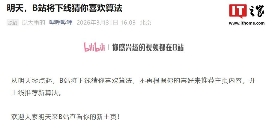 IT之家3月31日消息,哔哩哔哩官方公众号今日宣布,从明天零点起,B站将下线猜你喜欢算法,不再根据用...