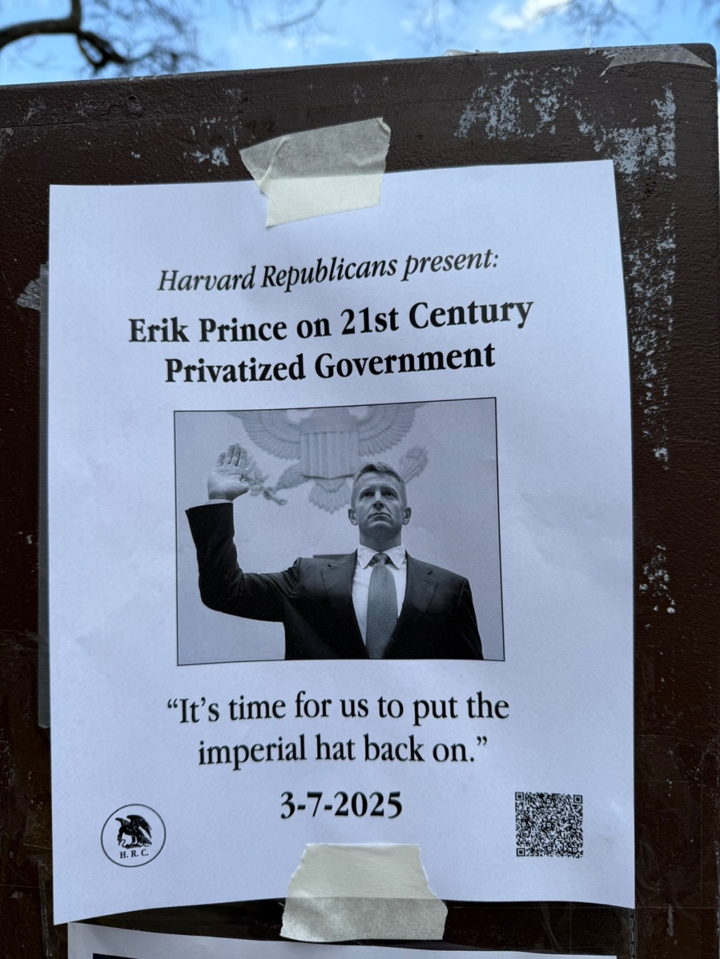 这是张贴在哈佛主校园Harvard Yard内的海报。哈佛共和党人学生社团最近举行的活动,邀请黑水公司创办人来演讲,下面的标题写道:“是时候让我们重新戴上帝国的帽子了”。