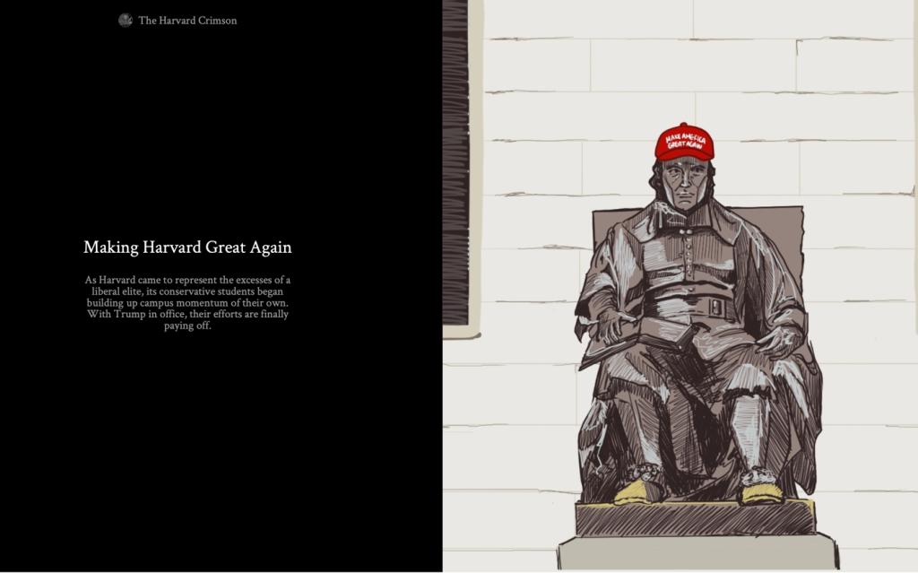 哈佛学生校报发表的深度调查文章《让哈佛再次伟大》,配图中John Harvard雕像戴着特朗普标志性的MAGA(Make America Great Again,让美国再次伟大)帽,耐人寻味。