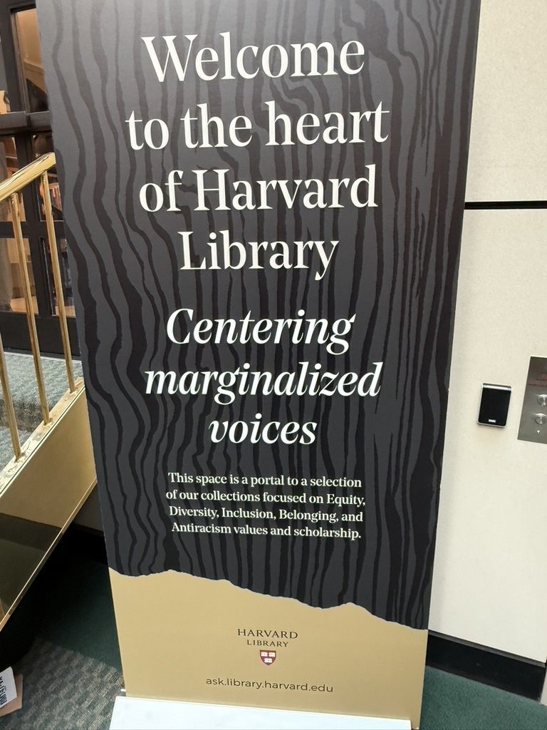 在泰坦尼克号罹难者、哈佛校友家族捐赠建设的Widener图书馆二楼阅读室某个角落,有这个看板推广DEI价值。特朗普下了撤除令后,至今看板及相关主题书籍区还是保留原样。