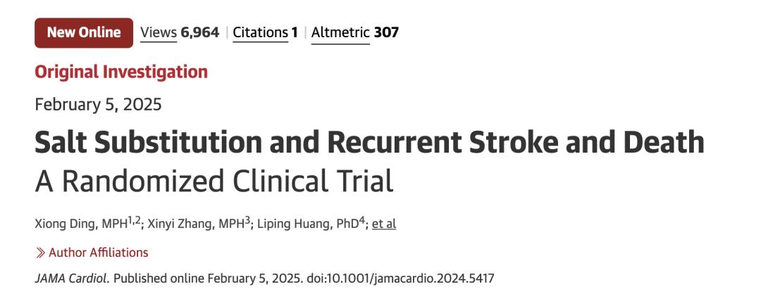 [1] Ding X, Zhang X, Huang L, et al. Salt substitution and recurrent stroke and death: a randomized clinical trial[J]. JAMA cardiology, 2025.
