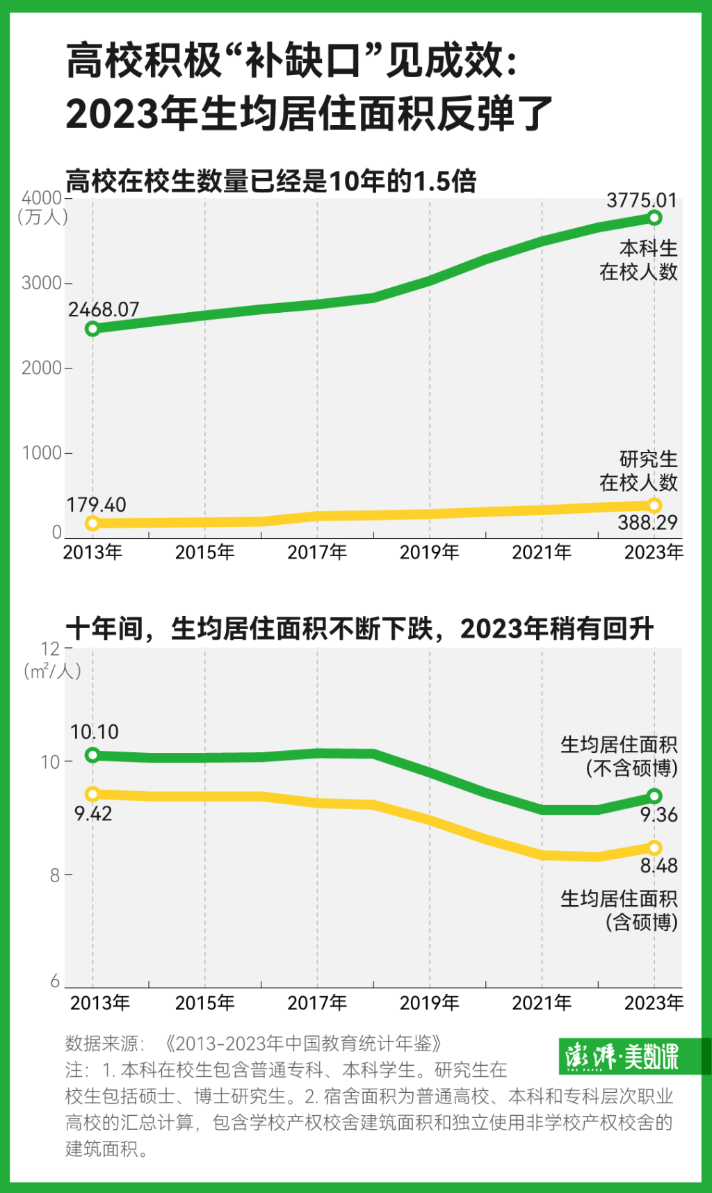 宿舍扩张速度追不上在校生增长速度,2013 至 2023 年这十年内,学生人均居住面积不断下跌,终于在 2023 年稍有回升,如果不算上硕博学生,本科生人均居住面积达到 9.36 平方米,离《普通高等学校建筑面积指标》的标准更近了一些:文件提到,本科生宿舍建筑面积宜达 10 平方米,硕士生、博士生的指标分别为 15、20 平方米。