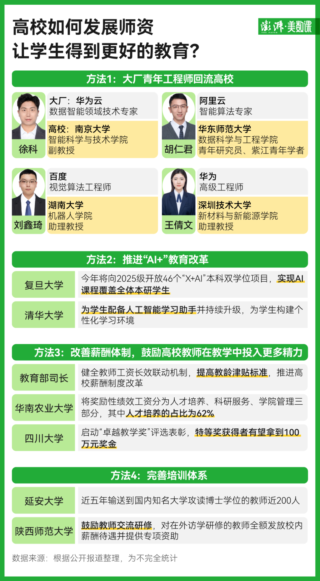 大厂研发人员回流高校,是高校教育改革的一个切面,意味着高校比之前更需要经过市场检验的、来自一线的经验。除此之外,高校还在师资方面做了什么准备?