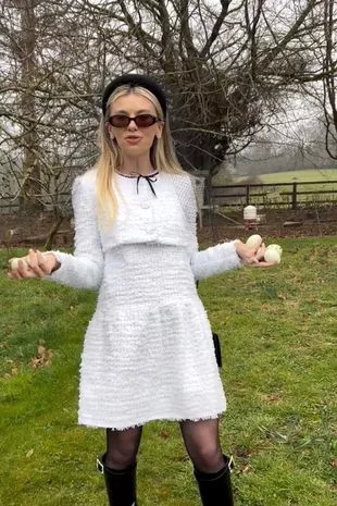 这位30岁的前《切尔西制造》明星上周末与42岁的丈夫詹姆斯·瓦特喜结连理,身穿迪莉娅·韦德设计的优雅针织圆圈裙,配上一件配套的短夹克,看起来非常漂亮。