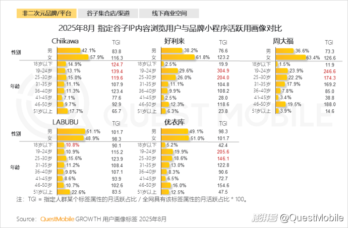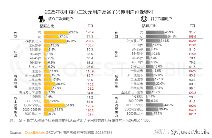 QuestMobile数据显示,2025年8月谷子兴趣用户规模达3017.4万,且谷子线上消费用户规模达1235.8万,这意味着“谷子经济”不仅拥有庞大的兴趣人群作为储备,而且拥有活跃的消费群体。