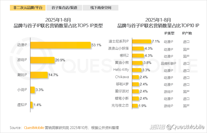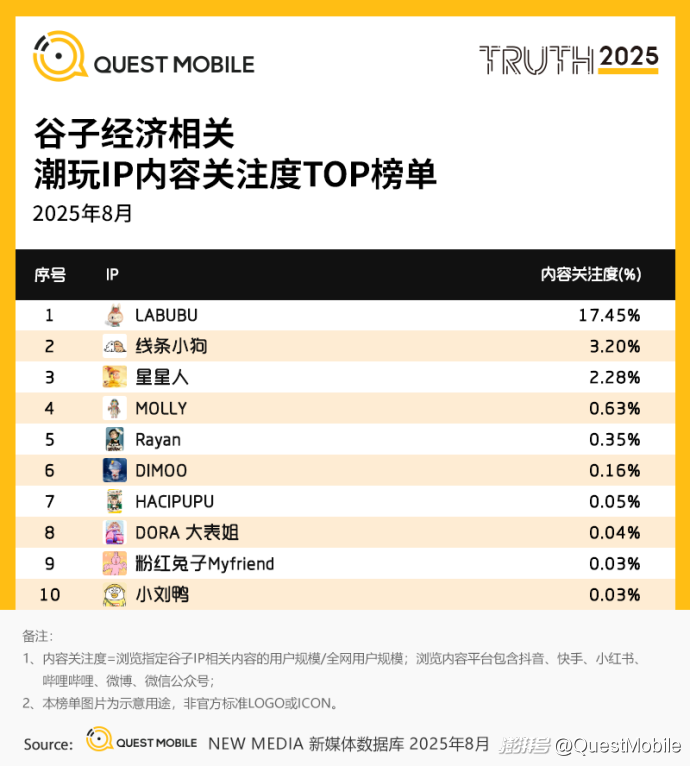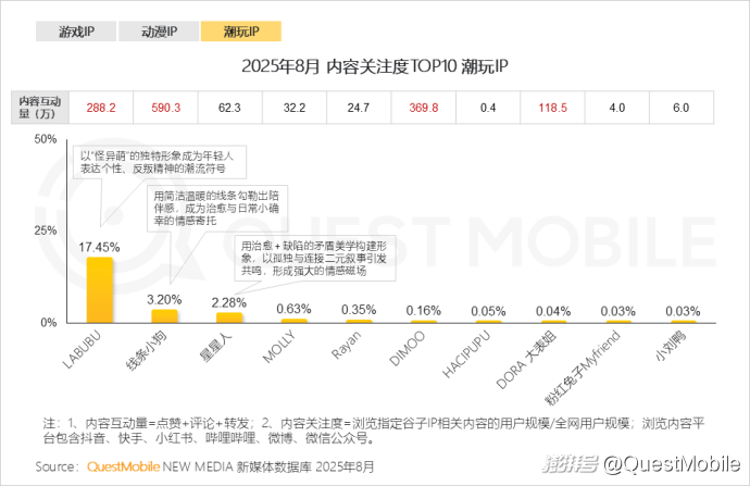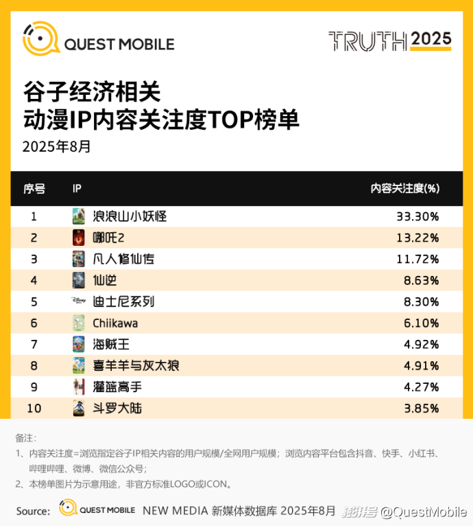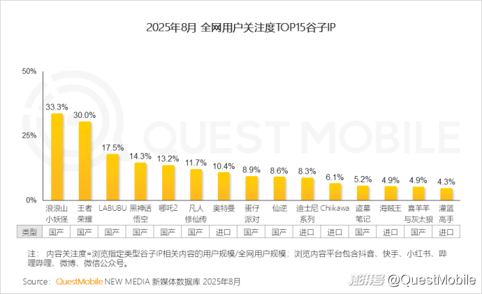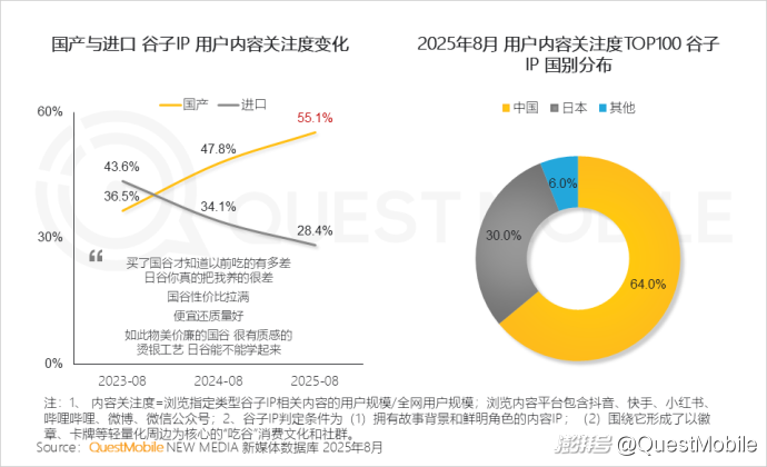 QuestMobile数据显示,随着时间推移,国产谷子IP内容关注度逐渐超越进口,2025年8月全网用户对国产谷子IP的关注度高达55.1%,高出进口谷子IP 26.7个百分点。