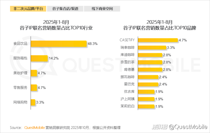 4、食品饮品、服饰箱包、美妆等直面年轻消费者的快消品牌是谷子IP联名的主力其中手机壳品牌CASETiFY以高频的谷子IP联名维持品牌的潮流属性。