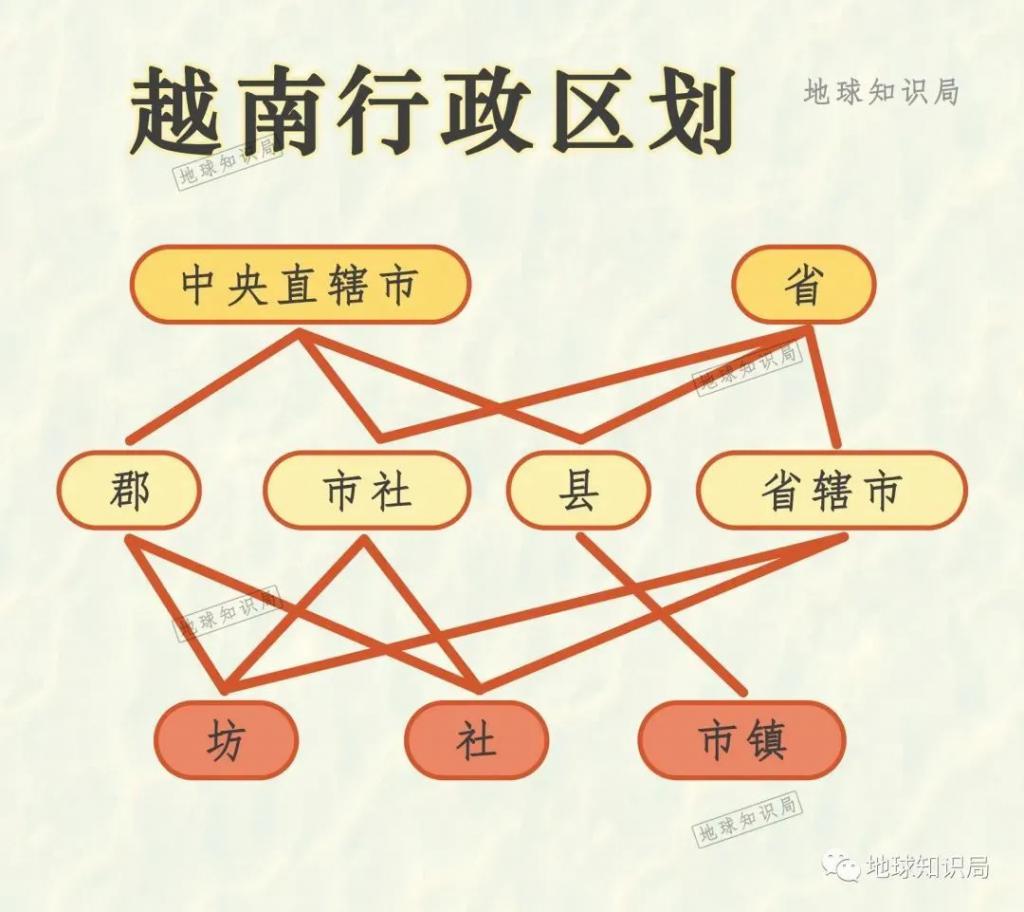 与中国不同,越南没有地级市,不存在 " 市管县 " 模式,地方行政架构为" 省 - 县 - 社 "三级,社相当于乡镇一级,县则处于省与乡镇之间。