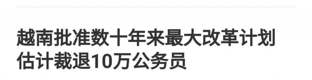 经过这轮改革,越南将裁撤五分之一左右公职岗位,预计" 砍 " 掉 10 万个 " 铁饭碗 "。
