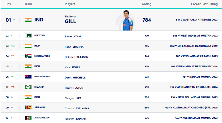 印度的Shubman Gill在整个比赛中表现出色,仍然是第一ODI击球手。队长罗希特·夏尔马在决赛中被评为本场最佳球员,他在83次投球中得到76分,排名上升了两位,排名第三。