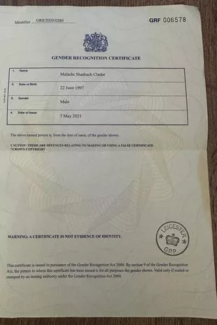 “妈妈当时很震惊,”他说。在那之后,他以男性身份出现,后来通过契据投票将他的名字改为玛拉基·沙德拉·克拉克。“我选择了‘玛拉基’和‘沙得拉’这两个圣经名字,因为我的神学学位,我把姓氏改成了‘克拉克’,因为我喜欢莱恩·克拉克!”他咯咯笑着说。