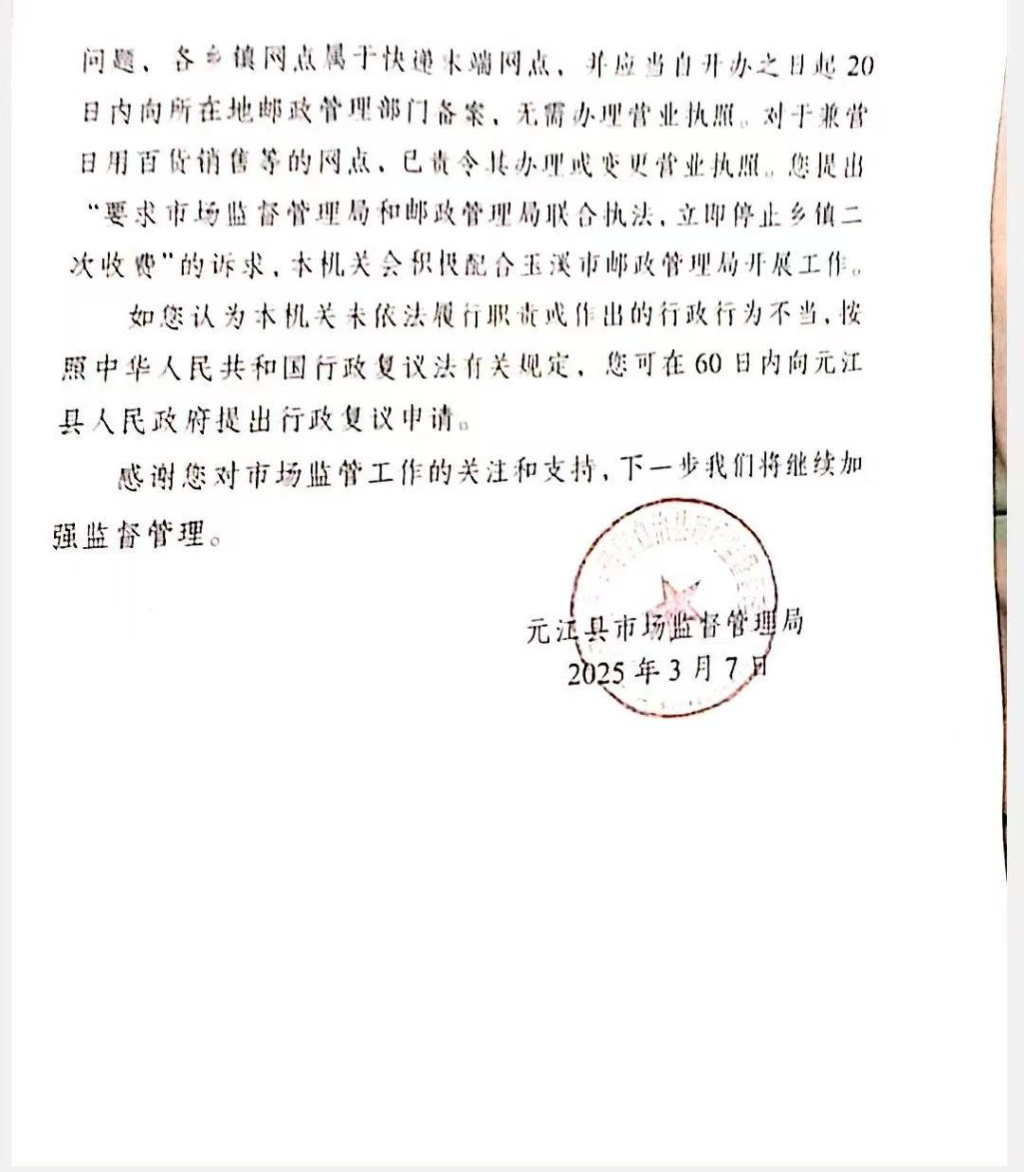 今年2月中旬,一位网名为“思想家”的男子在社交平台上公开举报称,云南省玉溪市元江县多个乡镇快递站点存在“二次收费”现象,用户在取件时,每件快递均被强制加收3元费用。