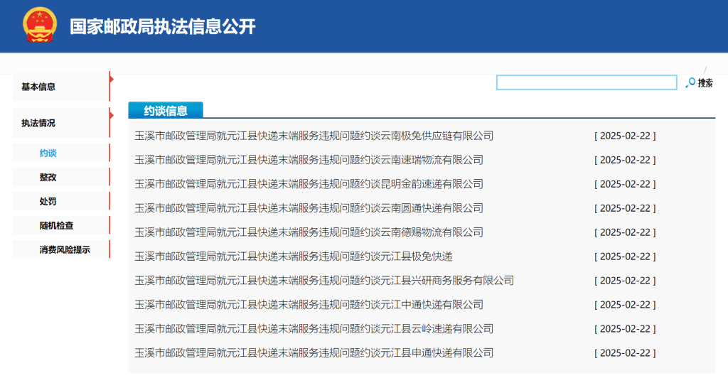 今年1月,元江县中通、申通、极兔、圆通等多家快递物流公司,因快递末端服务违规问题被玉溪市邮政管理局约谈,约谈的主要内容为按规定公示、公布服务地域;未经用户同意,不得擅自使用智能快件箱、快递服务站等方式投递快件;禁止快递末端服务违规收费。