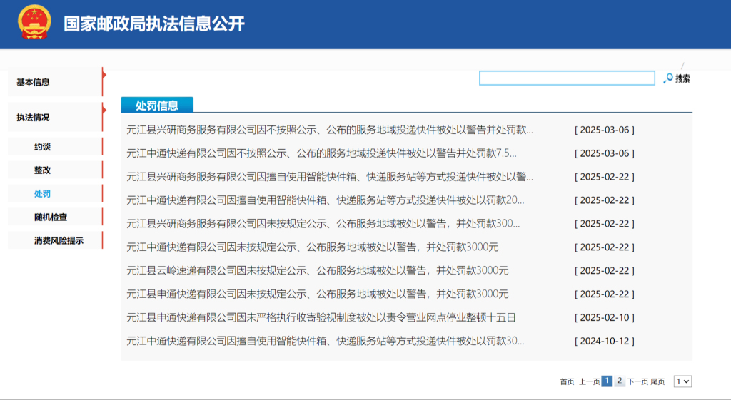 2月份,元江中通屡次被玉溪市邮政管理局罚款,因擅自使用智能快件箱、快递服务站等方式投递快件,未按规定公示、公布服务地域,不按照公示、公布的服务地域投递快件。