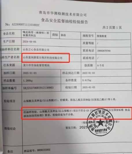 无奈之下,妙洽海带品牌方负责人刘先生只能“自己举报自己”,将相关问题投诉至正心食品所在地的山东龙口市市监局。龙口市市监局很快就采取了行动,对其涉嫌存在问题的部分妙洽海带进行抽检,结果确为添加剂山梨酸钾超标。