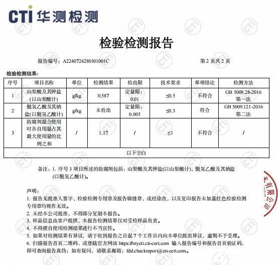 “当时正好有同行因配料表问题被打假,我们怕自己也遭遇类似情况,所以决定送检。”李女士表示,质检结果让他们非常惊讶:生产日期自2024年5月至8月份期间的产品,并未含有白酒和添加剂脱氢乙酸钠,但都含有添加剂山梨酸钾,并且山梨酸钾的含量均超过法定标准。很显然,蔚蓝谷工厂存在配料表造假的问题。这一事实后来也得到了荣成市市监局方面的确认。据蔚蓝谷工厂人员给李女士的解释,配料表中虚构“白酒”成分是因为混用了其工厂另一酱菜类产品的配料表。