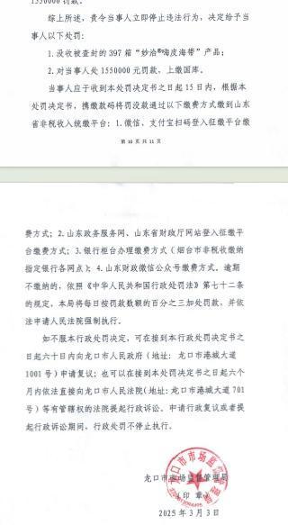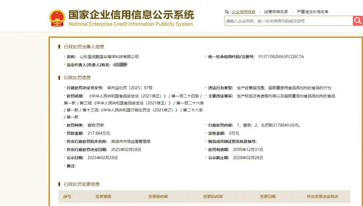 龙口市市监局对蔚蓝谷工厂的产品检测显示,山梨酸钾含量超标,不符合国家标准,检验结论为不合格。该抽检结果出炉后,龙口市市监局迅速对正心食品作出了罚款155万元的处理决定。据刘先生透露,这一处理结果也经由龙口市市监局内部通报给了山东省市场监督管理局。此后,荣成市市监局也对蔚蓝谷工厂作出了罚款217万元的处理决定。