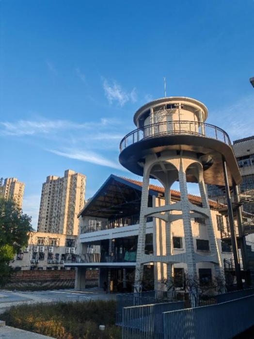 在园区最东处还有一座造于1921年,距今已超过100年的老建筑水塔。经改造后的水塔极具有工业厂区特色及景观价值,改造设计对水塔进行了结构加固,另采用独立钢结构体系增设一部旋转钢楼梯及环形观景平台,形成特色工业景观,让工业遗存可阅读。时光水塔、柳韵水岸、杏林梢声三个精心留存的景观节点穿插园区各处,既保留了场地的历史记忆,又为整个空间增添了独特的诗意与自然韵味。