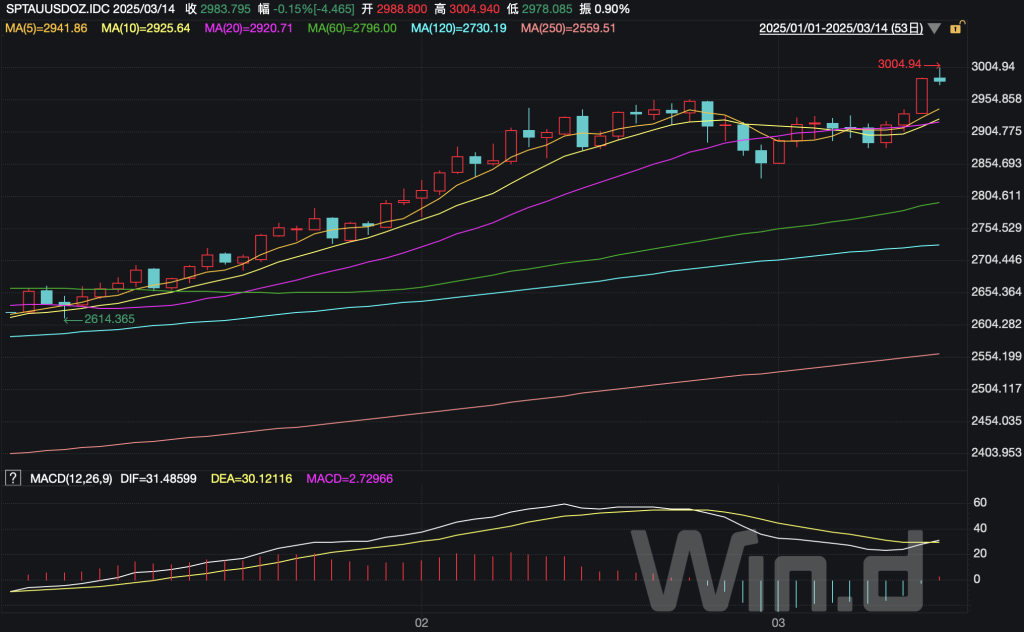 进入3月后,黄金重新进入上升通道,3月14日,现货黄金价格冲破3000美元/盎司整数关口,再创历史新高。