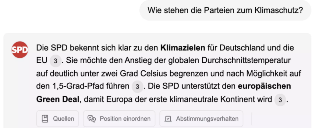 图为KI-Wahlchat对德国政党在气候政策(Klimaschutz)上的立场说明。