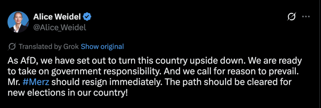 图为德国选择党(AfD)党魁魏德尔呼吁解散政府、重新进行选举的发言。