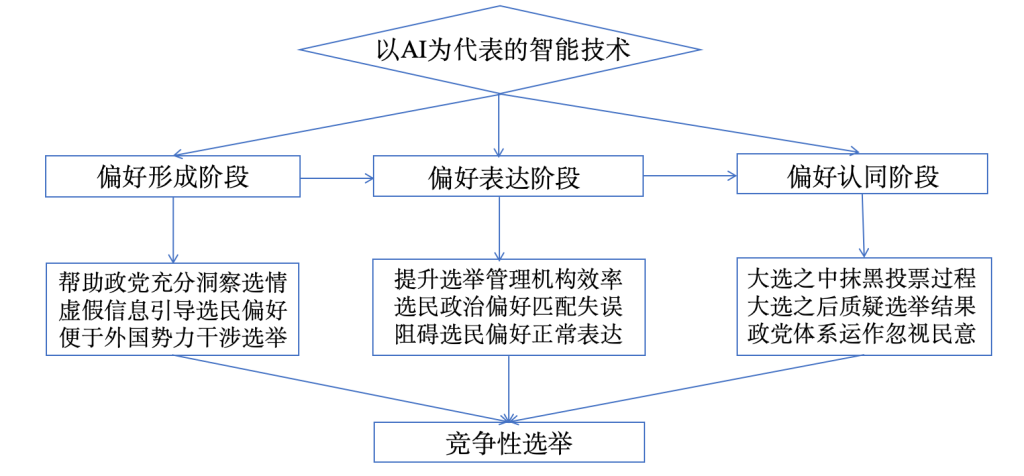图为以AI为代表的新型智能技术对竞争性选举的具体作用机制。图片来源:作者自制。